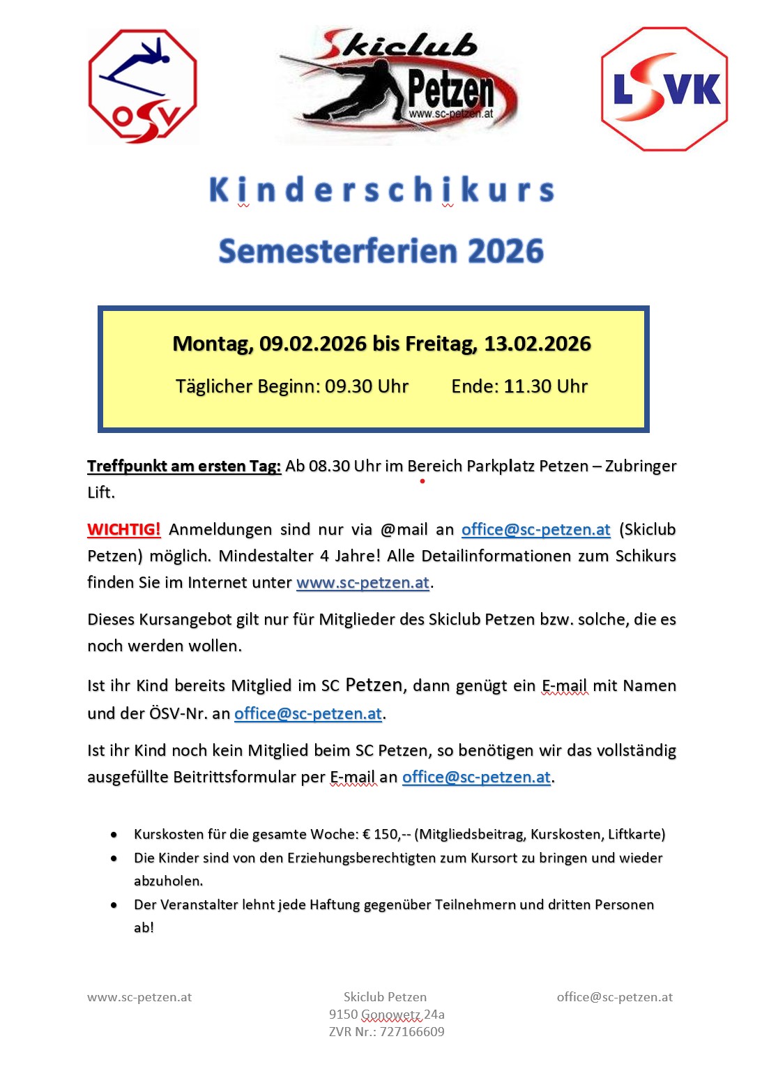 Die Anmeldung ist nur mit @mail an mitgliedschaft@sc-petzen.at möglich. Telefonische Anmeldungen können aus administrativen Gründen nicht entgegengenommen werden. Bitte haben Sie etwas Geduld, Sie bekommen eine Antwort von uns, aber eben nicht in der nächsten Sekunde. Wir bearbeiten den Kinderschikurs und die Administration in unserer Freizeit!